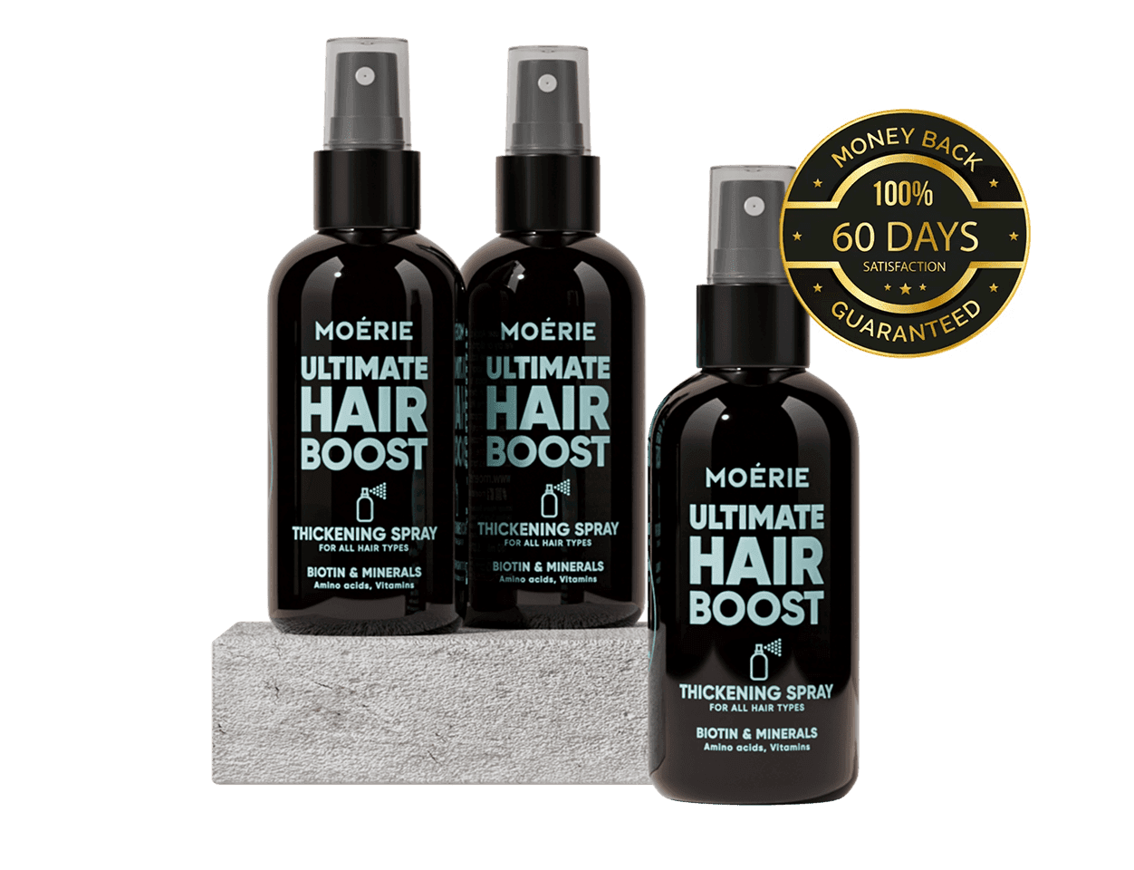 We understand that trying new products can feel risky, which is why Moérie offers you a completely Risk-Free experience. With our 60-Day Money Back Guarantee, you can try our Ultimate Hair Boost Thickening Spray with confidence. Achieving full, healthy hair has never been safer or easier!